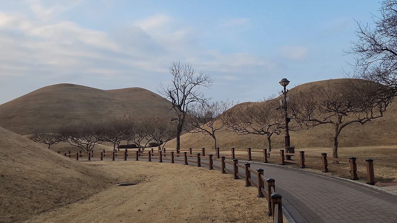 미리 찾아온 카페(향미사)에서 라떼 한 잔에 몸을 살짝 녹인 후에 다시 황리단길 한편에 위치한 대릉원으로 향했다. 도보로 움직일 수 있는 거리에 유적지들이 오밀조밀 모여있는 것이 정말이지 큰 장점이었다. 대릉원은 그 유명한 천마총부터 미추왕릉 등 7곳의 크고 작은 고분들이 모여있는 유적지구다. 공원처럼 잘 구성되어 중간중간에 위치한 표지판을 보며 놀멍 쉴 멍 발길 닿는 대로 걸으면 한 바퀴를 금세 돌아볼 수 있다. 대릉원은 무료입장인데 천마총 내부만 유료 입장이다.