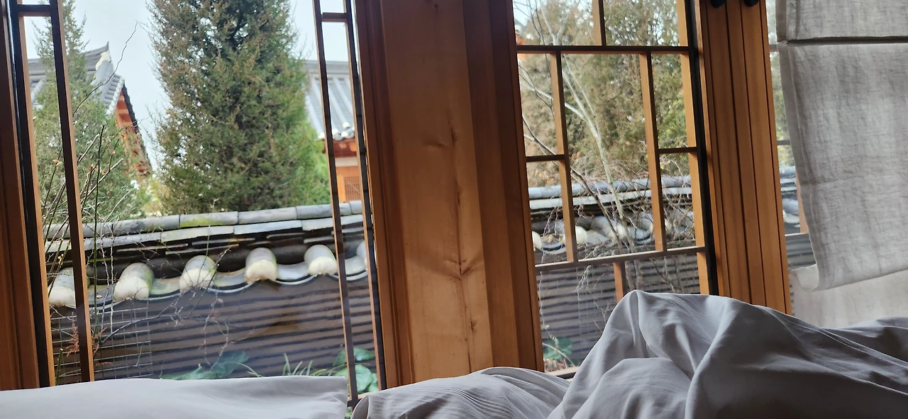 첫째 날 야경투어까지 야무지게 마친 후에 숙소로 돌아와 남은 와인에 유유자적 여유를 즐기다 잠들었다. 새소리에 눈을 뜨니 아침이었는데 현대식 한옥샤시 이지만 창살 너머 비추는 아침햇볕이 너무 평화로웠다. 침대 아래 온돌도 뜨끈하게 데워졌겠다, 창문을 활짝 열었는데 아마 이번 경주여행 중 가장 좋았던 순간이 아닌가 싶다. 이불속은 따뜻하고 너무 춥지 않은 찬 바람이 얼굴을 훑고 지나가는데 눈 앞에 풍경은 그저 한옥의 목조기둥과 창 밖의 화단뿐이니 순간 더할나위 없이 평안한 마음이 들었다. 돈 많이 벌어서 한옥(물론 현대식) 지어 살고 싶다는 마음이 솟구쳤달까.