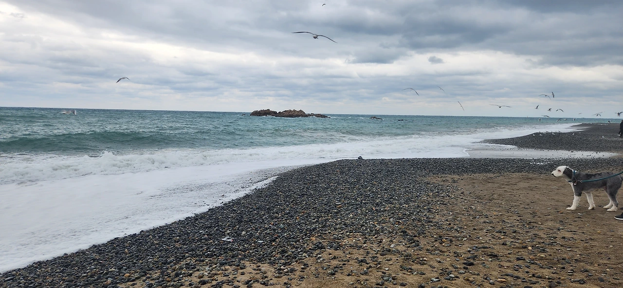 멀리 보이는 문무대왕릉(바위섬), 그리고 지나가던 쉽독(이름은 달구래요♡)