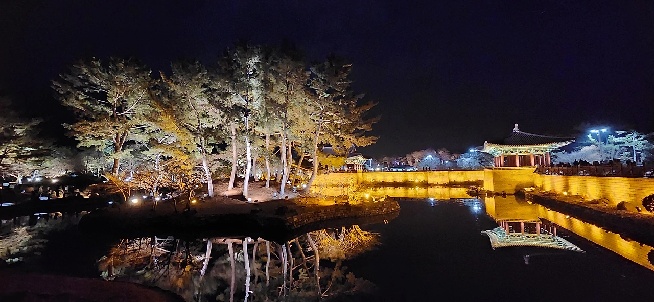첨성대에서 멀지 않은 곳에 다음 목적지가 있다. 아마도 경주 야경스팟으로 가장 유명한 곳이 동궁과 월지가 아닐까 싶다. 통일신라 시대 왕족의 별궁으로 '안압지'라고 불리던 곳이 지금의 이름을 얻게 되었다. 왕족이 큰 잔치를 벌였던 장소라고 하니 화려함은 물론, 연못에 비춘 야경은 조명 덕분이겠지만 환상적인 느낌마저 주었다. 하지만 한적해서 충분히 야경을 즐길 수 있었던 월정교와 다르게 사람이 정말 정말 많았다. 다들 온갖 포즈로 인증샷을 남기느라 정신이 없었다. 혼자 여행자인 나는 누구의 사진에도 찍히지 않겠다는 각오로 호다다닥 한 바퀴를 돌아 서둘러 나왔다.