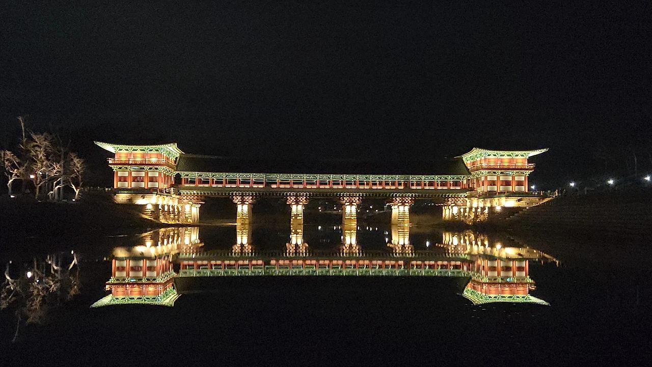 평소에 그알 유튜브를 많이 본 탓일까, 바짝 긴장하여 시골길을 사주경계하며 약 10분 정도 걸으니 월정교가 나왔다. 와. 너무 아름다웠다. 월정교를 따라 만들어진 거리 이름이 '사랑길'이던데, 이 정도 야경이면 족히 사랑에 빠질 법 했다. 빨리 길을 나선 덕분인지 방문객도 얼마 없었다. 돌다리에 서서 남천에 비친 월정교를 보자니 마음이 몽글몽글 해지는 것만 같았달까. 분위기에 취해 야경에 취해 한참을 서 있다가 길을 나섰다.