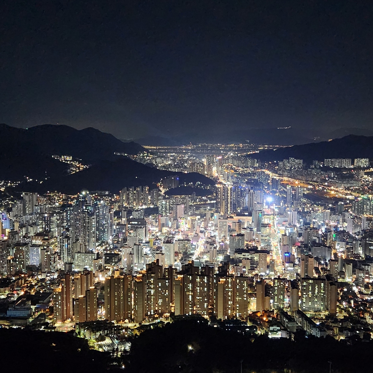 여러 번 들었지만 왜인지 발길이 닿지 않아 한 번도 가보지 않았다고 하니, 함께 간 친구가 그럼 명예 부산인이 될 수 없다며 야밤에 황령산으로 운전대를 이끌었다. 잘 관리된 산길 굽이굽이를 따라 차를 몰고 올라가면 주차장이 나온다. 그 주차장에서 오르막을 10분 정도 따라 올라가다가, '하이고 언니네 식구들 부산 왔다고 황령산 데꼬 왔는데 마 죽겠다!'는 옆사람의 푸념에 공감 섞인 웃음이 나올 즈음 도시의 불빛이 얼핏 얼핏 보이기 시작하는데...