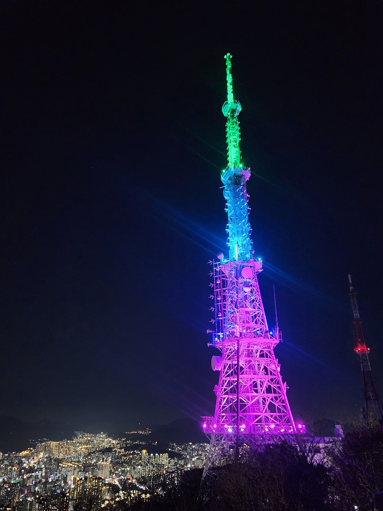 통신탑 조명이 트리처럼 반짝반짝