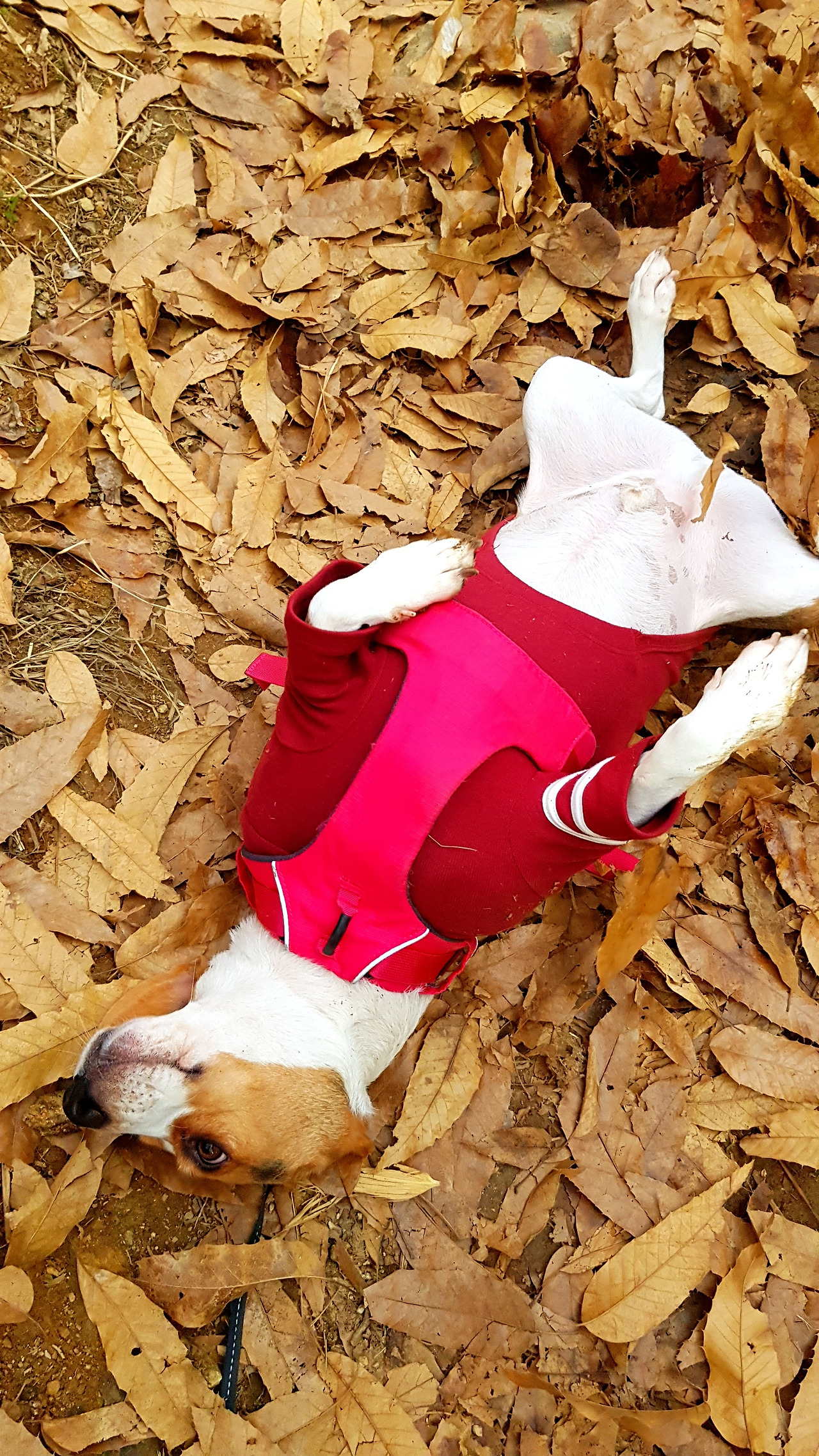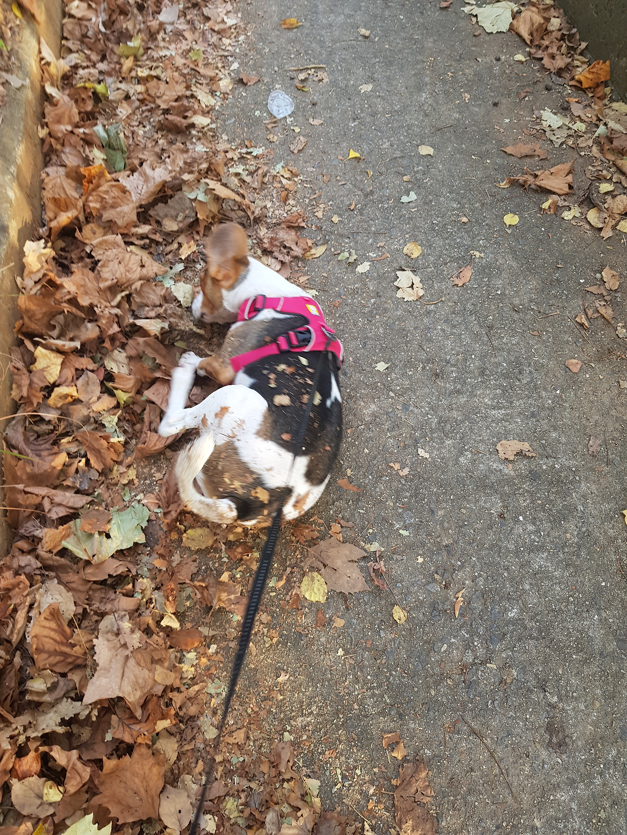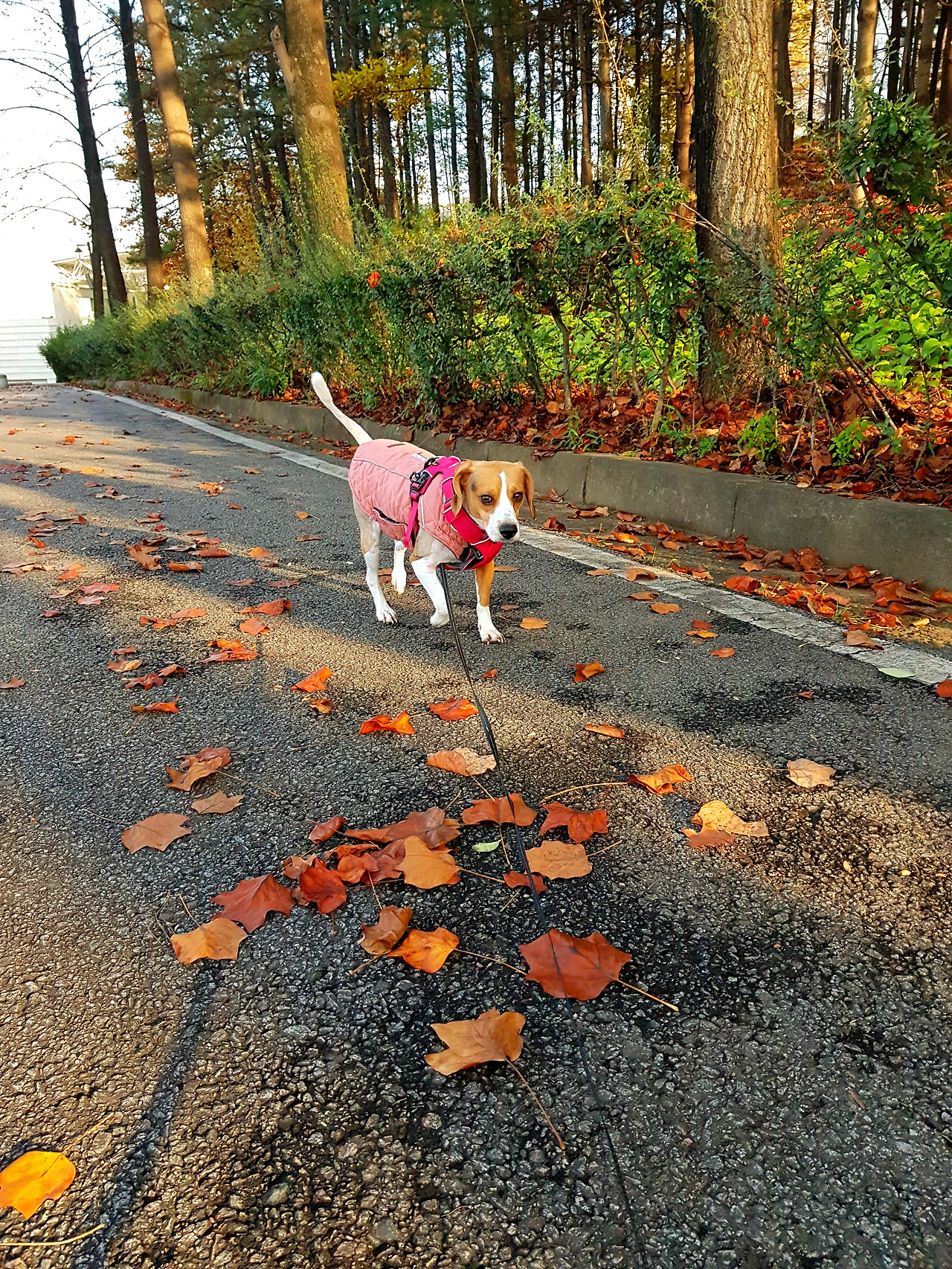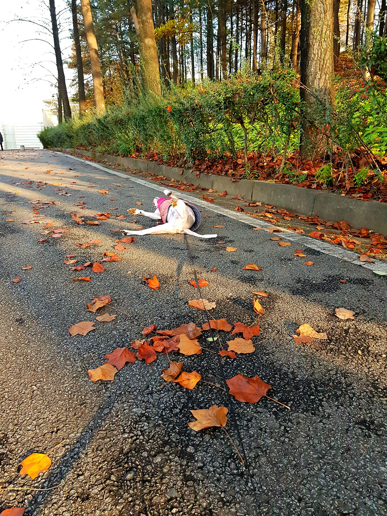 낙엽이 소복히 쌓인 길을 꾹이는 신이나서 깡총깡총 뛰어다녔다. 그러다 목적지에 다다라서 길 가에 쌓인 낙엽을 향해 미친듯이 뛰기 시작했다.