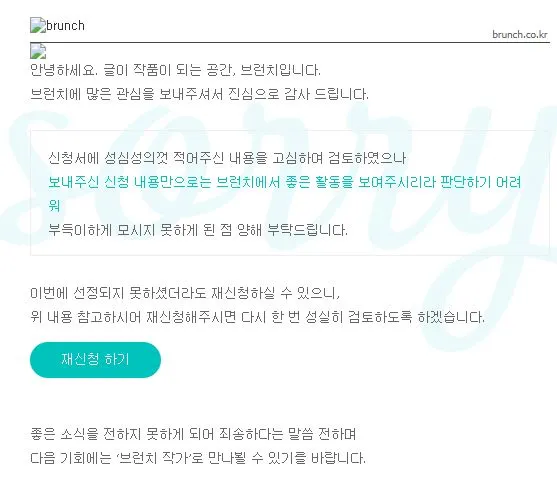 첫 번째 탈락 메일을 받았을 때는 잠시 당황했지만 바로 웃을 수 있었습니다. 가족들도 같이 웃어 주었고, 저도 누구나 가져보는 브런치 작가 신청을 거부당하는 경험을 한번 해 보는 해프닝이라는 생각을 했습니다.