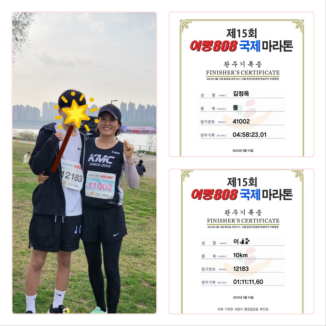 김 선배님이 다 왔다며 5시간 안에 달려보다고 "할 수 있다"를 계속 말해주시면서 시계를 자꾸 보신다. 나는 이미 시간 개념도 없고 이 순간이 빨리 지나가기만을 기다리며 한 발자국씩 겨우 떼었다. 나중에 보니 5시간 이전에 완주하게 하려고 계속 시계를 보셨다. 작년 풀코스가 5시간 34분인데 4시간 58분에 완주했다. 완전한 김 선배님 덕분이다.