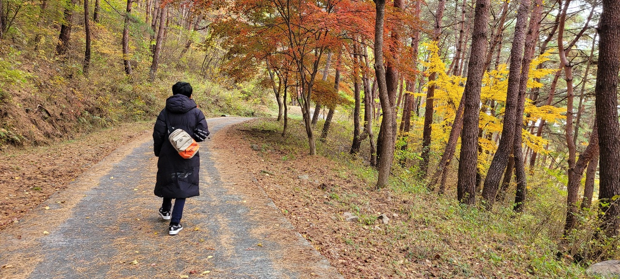 평일 금요일이라 그런지 지나가는 자동차가 한 대 지나갈 뿐 한적했다. 두 사람만이 둘레길 전체를 차지하고 있었다. 112독 서모임을 운영하고 있는데 1개월에 1권 2회 읽는다고 해서 112 독서모임이다. 1번 읽는다고 의미를 다 아는 것도 아니라서 최소한 2회는 반복해서 읽고 생활에서 지혜를 찾아보고 실천하자는 뜻으로 읽는 모임이다. 11월의 책은 에크하르트 톨레의 '지금 이 순간을 살아라'이며 이번 달에는 06시에 1시간 동안 낭독 후 느낌을 말하고 있다. 내용 중에 '공간을 느껴보라'는 부분이 있다. 우리는 시간상의 흐름으로 대부분 살아간다. 명상을 할 때 공간을 느껴보라는 말이 처음에는 참 의아하게 생각했는데 자꾸 하다 보니 나를 입체적으로 보는 것 같기도 하고 시간과 함께 앞으로만 가는 존재가 아닌 이 세상과 함께 살아간다는 존재라는 느낌이다. 사람은 공간 자체라는 말과 만물은 비어있다고 한다.