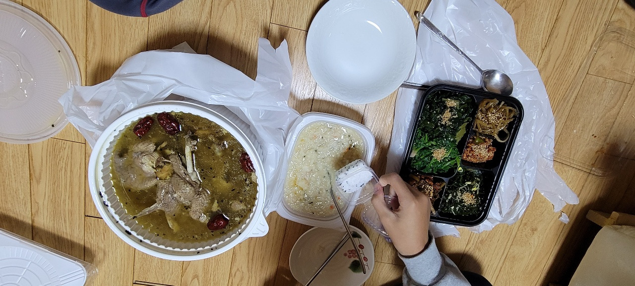 운영하고는 있는데 개인적인 일이 있어서 오늘 저녁만 안 한다는 것이다. '이 식당에서 먹으려고 저녁에 먹을 음식을 안 사 와서 큰 일이네요.'라고 혼잣말로 말했더니 아주 맘에 드는 제안을 하신다. 주문을 하면 펜션 옆 식당이니 펜션으로 가져다주시겠다는 것이다. 지혜로운 분이시군. 손님 음식도 해결하고 볼 일 보러도 가시고. 그럼 좋고 말고요. 아들은 닭백숙을 먹고 싶다고 했다. 가격을 물어보니 65,000원인데 나에게 그다지 착한 가격은 아니다. 한 달 살이를 해야 하는 나로서는 조금 비싸게 느껴진다. 둘이서 한 끼에 그 가격이면......이라는 생각으로 머뭇거리고 있을 때 아들이 말한다. 죽까지 있으면 아침까지 해결되는 거니까 그냥 하라고 한다. 그래, 그러자, 해결에 방점을 찍어주니 고맙다.