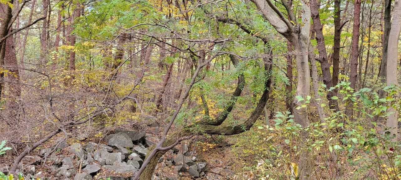 아들은 물들어 가는 나무를 보고는 예전 캠핑장에서 만난 월계수 나무를 생각해낸다. 그 월계수 나무는 꼭대기와 가장자리에서부터 나뭇잎이 노랗게 변하고 있었고 줄기 안쪽에는 아직 초록이라 날씨가 추워지고 먼저 난 잎들이 먼저 노랗게 변한 것 같다고 말한 적이 있다. 이렇게 나뭇잎이 다르게 물들게 가는 것을 보고 월계수 나무가 생각났나 보다. 변해가는 단풍, 은행나무 들을 이런 추억을 생각해낸 둘레길이 고마울 뿐이다.