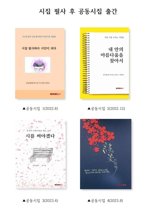 시집 필사 6권 총 600편을 필사하고 창작시도 습작이지만 600편을 했습니다. 시인 등단도 하고 공동시집 리더로서 4권을 지난달까지 출간하기도 했습니다.