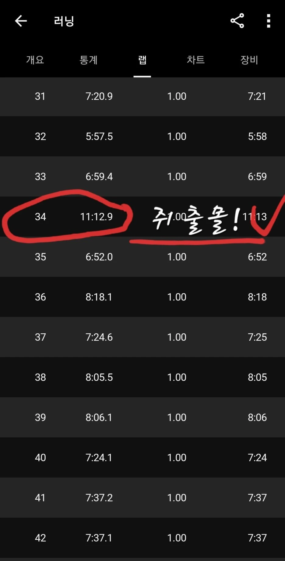 34km에서 오른쪽 발가락 2개가 붙어버리는 것 같이 쥐가 난다. 풀어주지 않으면 달리기가 힘들 것 같다.