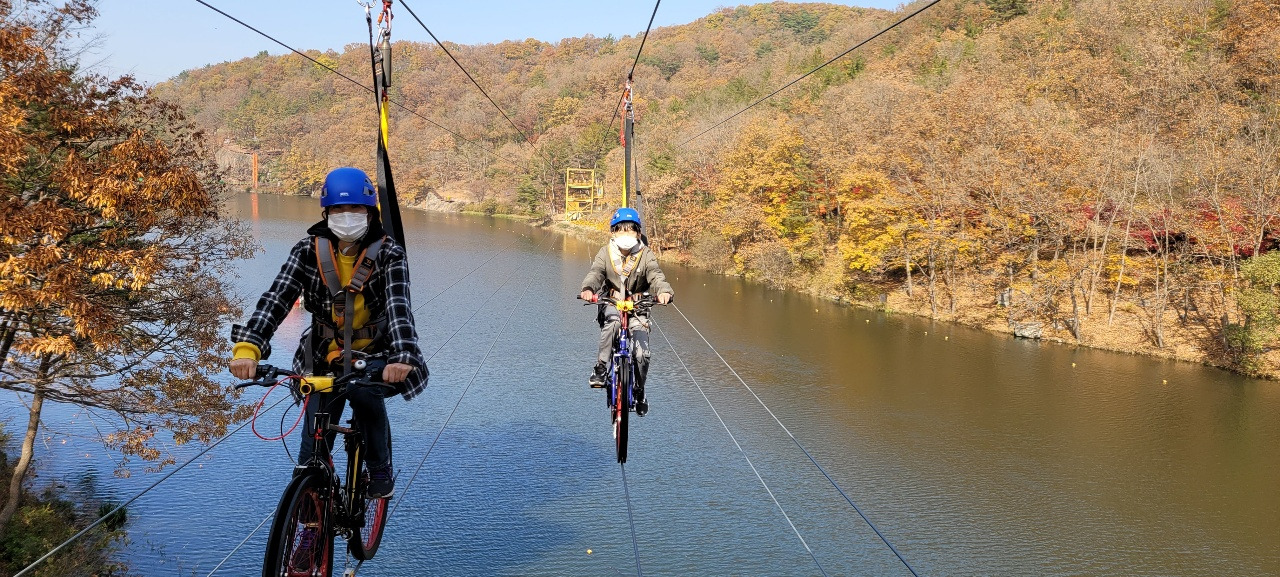 자전거는 왕복으로 다녀온다. 안전장치가 되어있어서 그냥 페달만 밟으면 되는데 보통 무서운 게 아니었다. 다리에 힘이 들어가고 눈을 위로 뜨거나 멀리 보면서 경치를 볼 상황이 아니었다. 내가 왜 이걸 하려고 했나 하는 후회가 밀려왔으나 되돌아갈 수도 없다. 아들을 쳐다볼 겨를도 없었고 보이지도 않았다. 페달만 빨리 돌려서 건너편에 가는 게 목적일 뿐이다. 생각과 달리 전혀 즐길 수가 없었다. 아들과 둘이서 나란히 반대 방향으로 갔고 직원도 옆 라인에서 같이 동행해서 갔다. 반대편에 도착하면 직원이 자전거 방향을 바꿔줘서 되돌아오는 시스템이다.