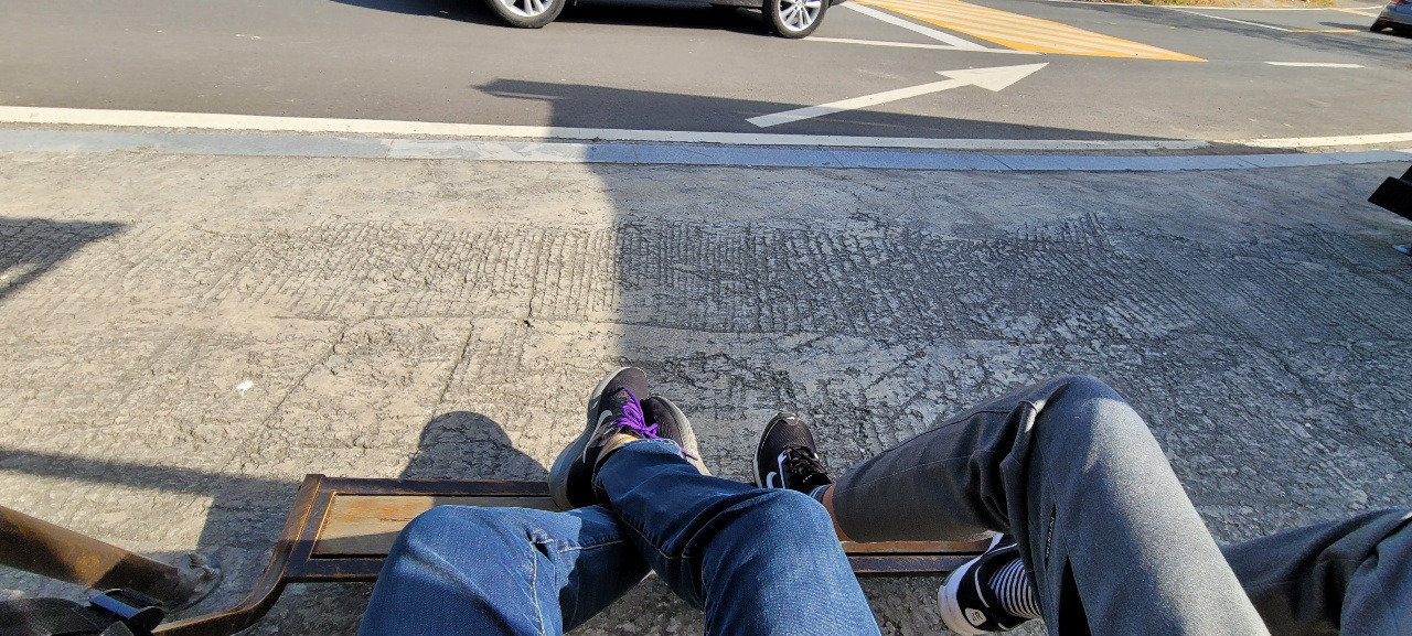 도로까지 나가서 찍길래 위험하다면서 빨리 오라고 큰소리치며 손짓했다. 가까이 오더니 " 엄마가 너무 예뻐서 저도 모르게 도로에게까지 나가게 됐어요."라며 너스레를 떤다. 그 말에 빵 터졌다. 결국 두 사람은 웃었고 화해 분위기가 조성되었다. 위험하니 절대 도로에 가지 말라고 재차 주의를 줬다. 아들은 검색을 하면서 어떻게 가야 하나 고민한다. 가야읍에 가서 버스를 타야 하니 지금 위치를 알아야 한다면서 핸드폰으로 '내 위치'를 검색한다. 버스를 타려고 검색하고 주위를 왔다 갔다 하다가 가야읍까지 가는 버스만 놓쳤다. 갈등이 있는 순간은 관계를 좋게 만들 기회다. 이 기회가 더 단단하게 맺어질 것임을 알기에 겉으로는 화나는 척했으나 속으로는 기뻤다. 아들과 내가 또 하나의 갈등을 문제 해결을 하게 되겠구나, 너나 나나 더 성숙해지겠구나 생각하며 즐긴다. 결국은 카카오 택시를 불러서 가야읍에 가서 오후 2시가 되어서야 늦은 점심을 먹었다. 뒤늦게 아들은 하늘 자전거를 탈 때 자전거가 순간 기울어져서 아찔했다고 털어놓는다. 너도 심장이 쫄깃했구나. 그런 게 경험이지. 타지 않으면 알 수 없는 경험. '엄마, 우리 이제 사이좋게 지내자'라고 아들이 말을 해서 그냥 웃어줬다.
