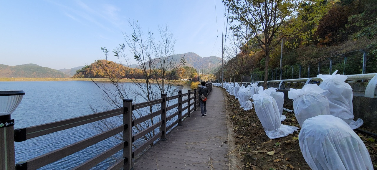 20분 이상 기다려도 버스는 오지 않았다. 정류장에 버스회사 전화번호가 붙어 있어서 회사로 전화를 해보았다. 내가 시간을 잘 못 안 것이다. '좌촌'이라는 마을 경유하지 않고 가는 버스를 마냥 기다린 셈이다. 1시간 이상 기다리느니 걸어서 20분 정도인 여항면 사무소 정류장으로 걸으라고 안내해 주신다. 다시 여항면 봉성 저수지를 지나게 되었다. 이래저래 봉성 저수지와 인연이 깊나 보다. 자꾸 만나게 되고 지나가게 된다. 버스를 놓치면 이렇게 20분 이상 가야 다른 정류장을 만날 수 있다. 이것 또한 새로운 경험이다. 시간을 느리게 활용하는 법, 매 순간을 대처하는 법을 배운다.