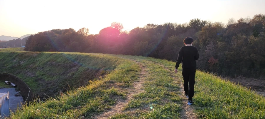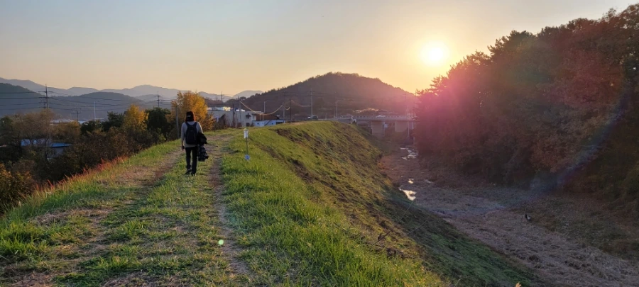 관동교를 지나자마자 반가운 하늘색 안내표지가 보인다. 풀밭 길이다. 거기다가 해가 막 지고 있다. 이런 풍경이라면 길을 헤맨 보상을 충분히 받은 거다.