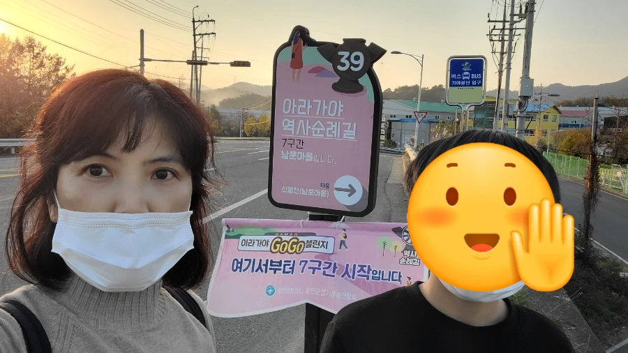 남문 마을까지 왔으니 6구간이 끝났다. 끝나는 지점에서도 사진을 찍어서 인증해야 하니 순순히 아들은 사진에 찍혀준다. 그러나 저러나 뽑기에서 시간 보내고, 3번을 헤맸으니 예상 시간 70분이라고 했으나 2시간이 걸린 셈이다. 쉽게 생각했는데 표지만 보고 초행길을 찾는 게 쉽지 않아서 다행이다. 인생처럼 이 길도 헤매다가 찾게 되고, 되돌아가기도 하고, 물어보기도 하고, 직진으로 가기도 한다. 너무 쉬우면 재미없지. 이러다가 총 7구간 다 걸을 수 있으려나. 불안한 예상대로 날이 어두워져 금세 캄캄해졌고 택시를 타고 숙소로 돌아왔다!