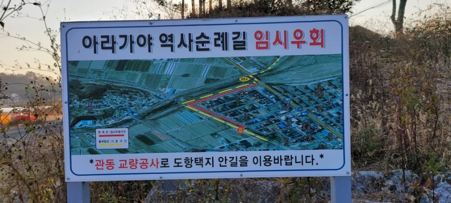 이 작은 안내 현수막을 따라가기만 하면 된다. '어렵지 않겠는걸' 하는 생각을 하면서 고분 근처를 걸어간다.