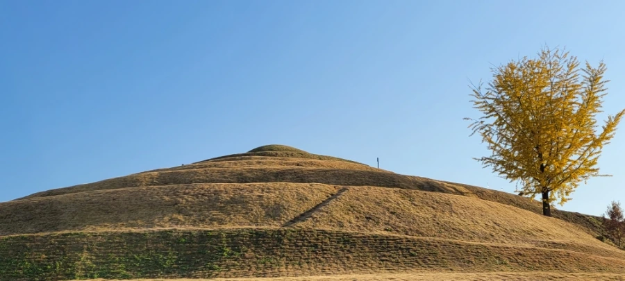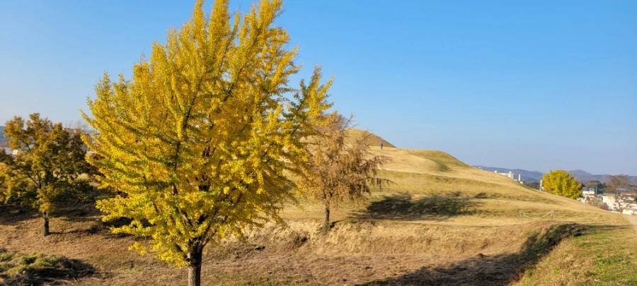 고분에 하나둘씩 있는 나무도 말이산고분군의 풍경 중 하나다. 은행잎이 다 떨어진 곳도 있고 이렇게 아직도 노랑 은행임을 품은 채 고분을 지키고 있기도 하다. 잔디가 겨울을 맞이하기 위해서 색이 바랬지만 은행나무는 아직도 노란색으로 건재함을 보여주고 있어서 꼭 수호신 같기도 하고 호위 장군 같기도 하다.