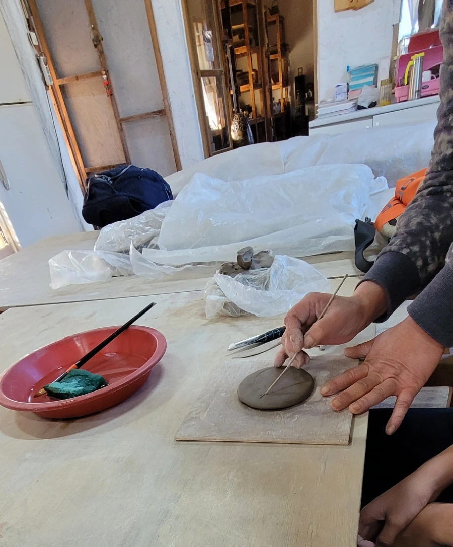 수레바뀌 모양 자석은 일단 빚은 흙을 납작하게 한 후 그 위에 그림을 그려서 파내거나 모양을 오려내는 방법이었는데 시간이 1시간 30분 정도 걸린 것 같다. 아들은 처음엔 쑥쓰러워하더니 선생님에게 여쭤보기도 하고 다 만든 후에는 어디에서 굽는지 궁금해서 같이 그릇을 굽는 곳에 둘이 다녀오기도 했다.