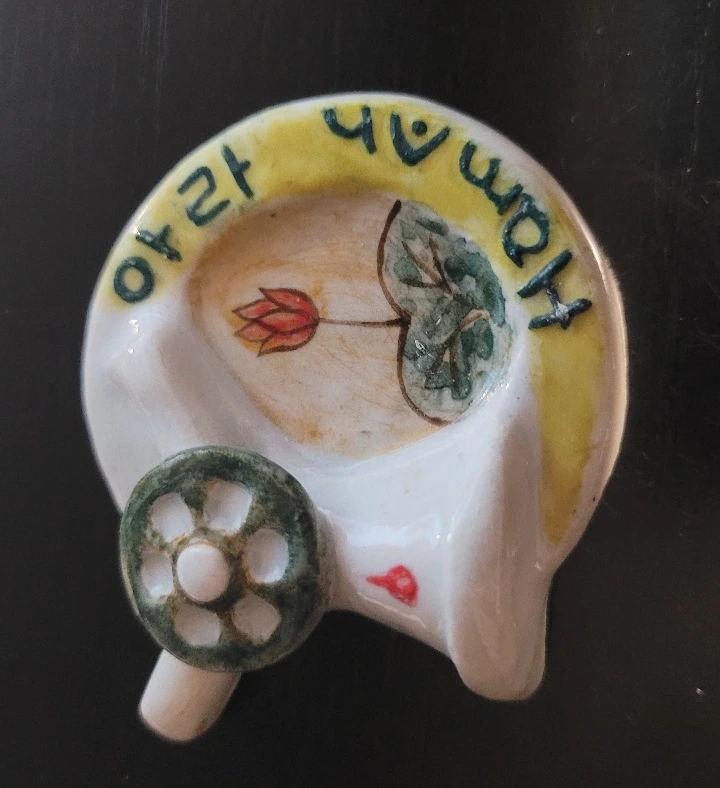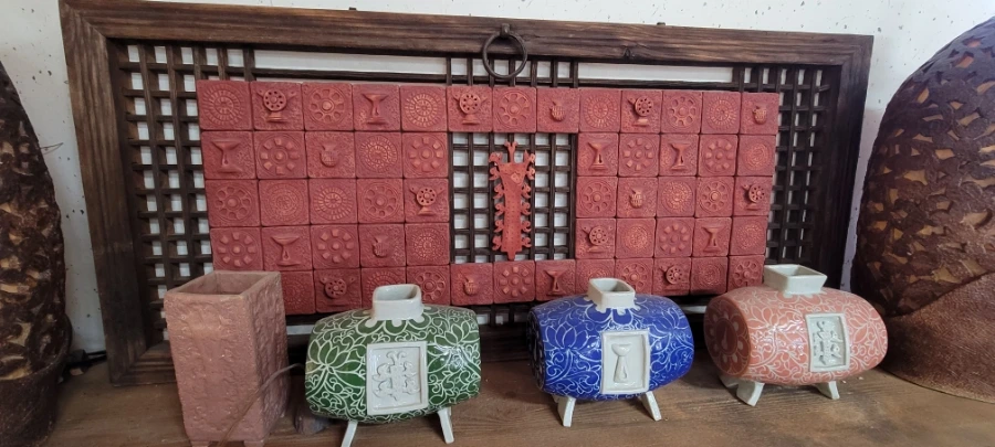 직접 만든 '불꽃무늬 토기'와 아들이 만든 '수레바뀌 모양 냉장고 마그넷'