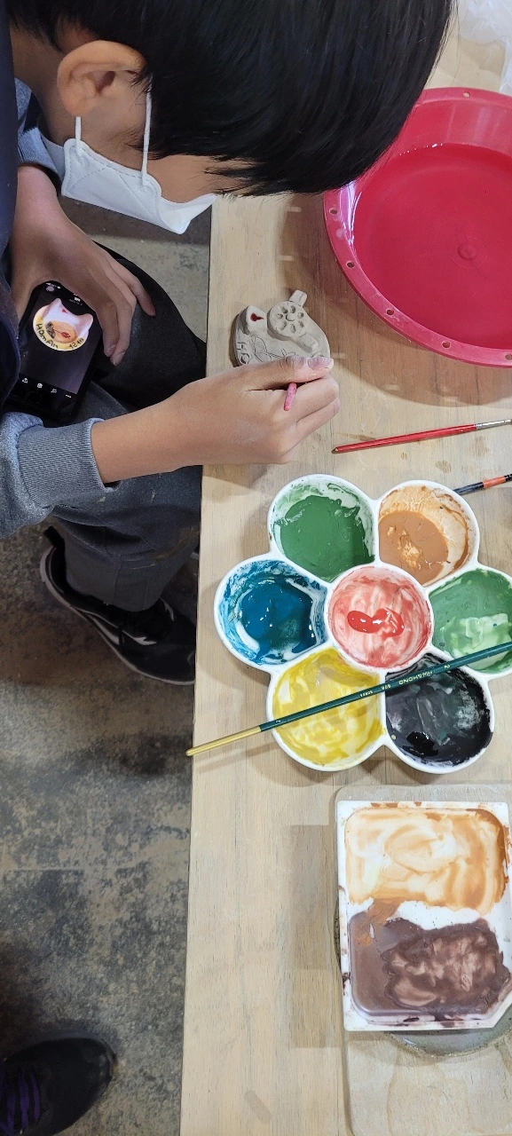 나는 지난번에 만든 냉장고 마그넷에 색칠을 칠했다. 물감처럼 생긴 것은 모두 돌가루라고 한다. 돌가루에서 이렇게 색깔이 나와서 신기했다. 1000도 이상 뜨거운 불에서 구워야 하니까 일반 물감은 아예 되지 않고 돌가루 물감이어야 한다.