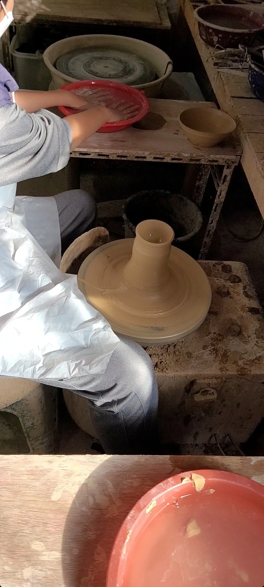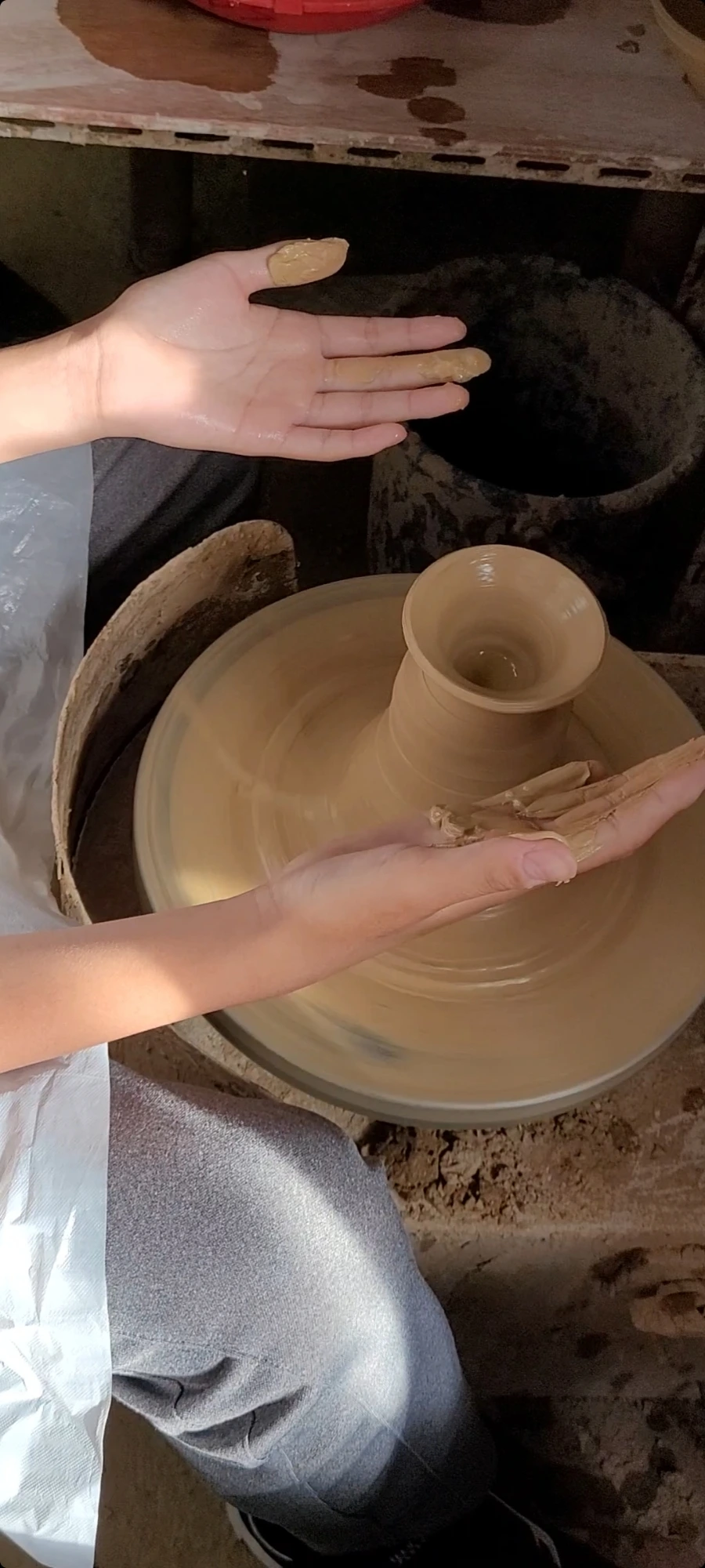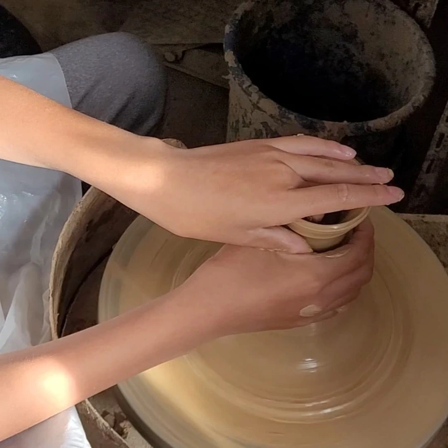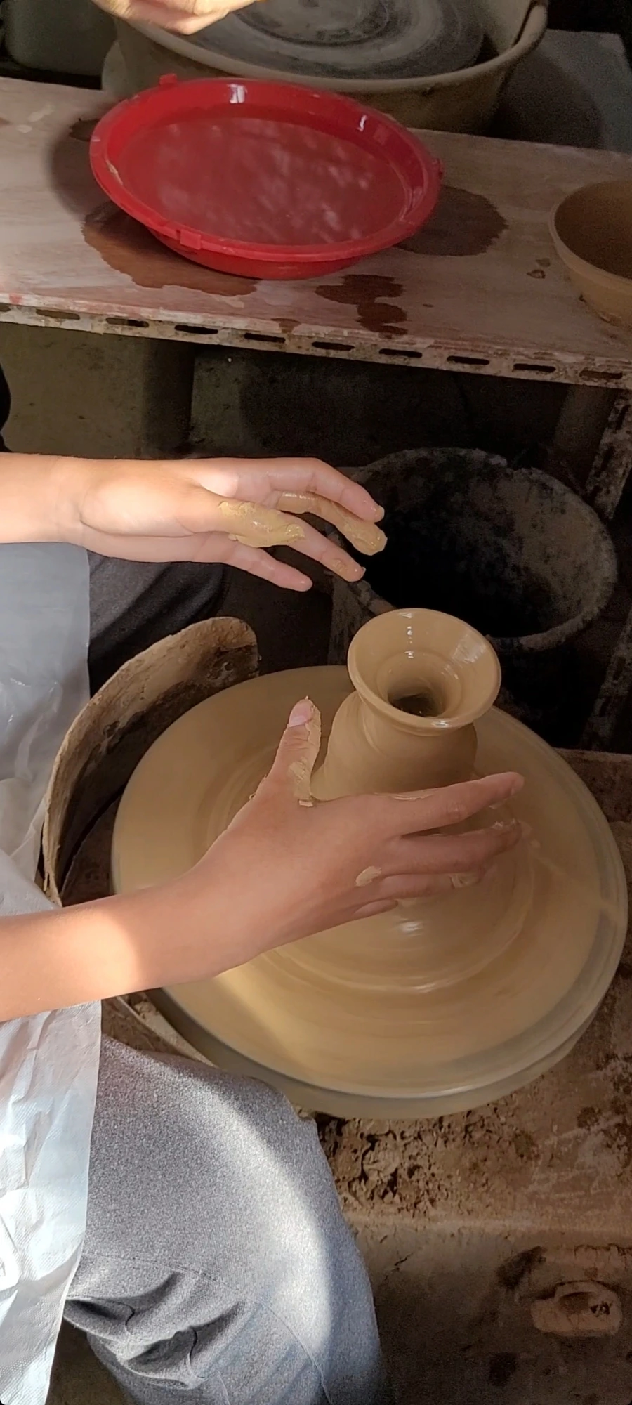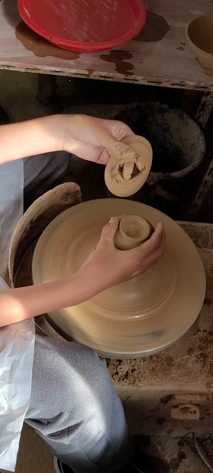 먼저 시범을 보여주시고 해봤는데 흙의 촉감이 아주 좋다. 클레이나 찰흙보다는 물기가 더 많아서 더 흙장난하는 느낌이 난다. 피아노 페달을 밟는 것처럼 페달을 밟으면 물레가 빙글빙글 돌아간다. 중심을 잘 잡아야만 균형 잡힌 그릇이 만들어진다. 어떤 그릇이든 만들어진다는 게 신기하다.