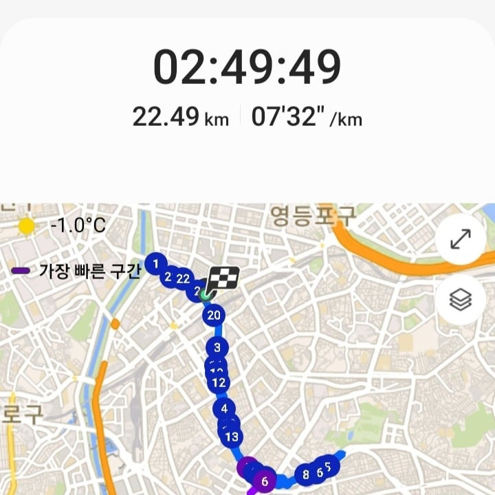 2시간 49분이다. 성취감을 느끼기도 전에 다리에 신호가 오기 시작한다. 걸을 때마다 욱신욱신 아프다. 계단에 앉고 싶은데 앉을 수가 없다. 양말은 젖어 그 축축함이 너무 싫어졌다. 빨리 갈아 신고 싶은 마음만 생긴다.