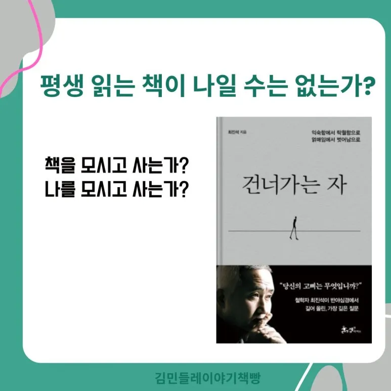 나에게 <<건너가는 자>>책의 의미는 자신을 궁금해하면서, 자신을 읽으면서 평생 살아가야겠구나 하는 의미, 그것도 혼자보다 함께 건너가기가 의미가 있겠구나, 어떤 고정된 틀, 상도 만들지 말고 유연해야겠구나 하는 생각이 든 책입니다.