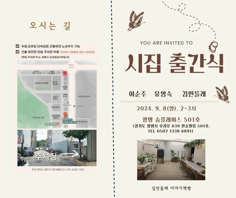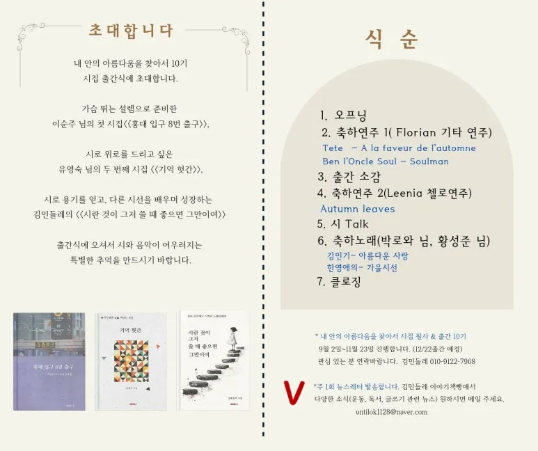 9월 8 일 시집 출간식을 하는데요, 초대장에 메일 주소를 받으려고 합니다. 적극적으로 고객 리스트를 모집하고 뉴스레터를 발송할 예정입니다.