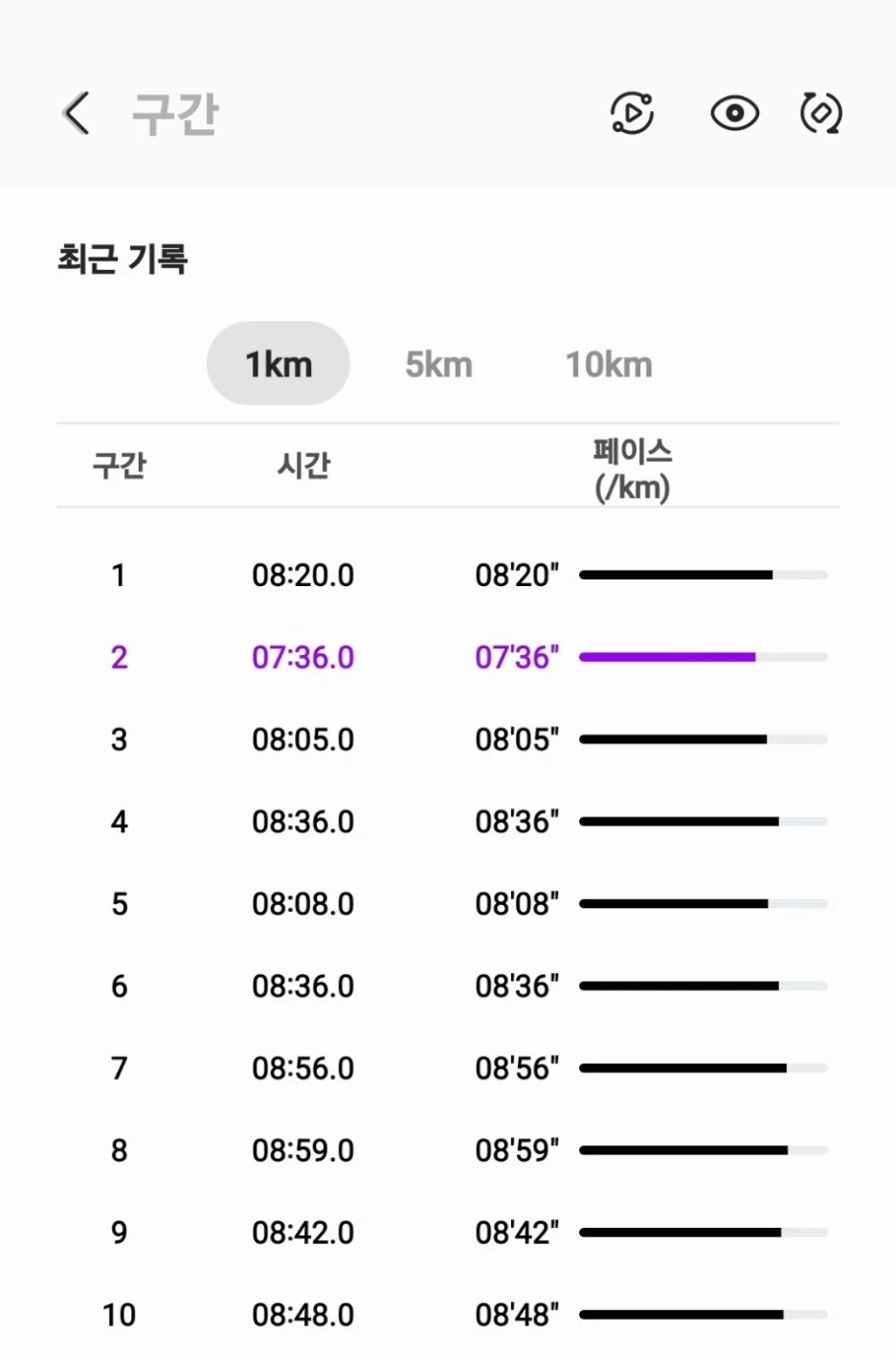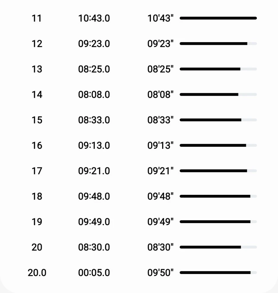 11km 지점에서 간식을 사서 기록이 가장 저조합니다. 저 같은 수준은 기록을 아직 논하기보다 연습에 초점을 두고 달리지만 나중에 기록을 보면 흐뭇하고 뿌듯합니다.