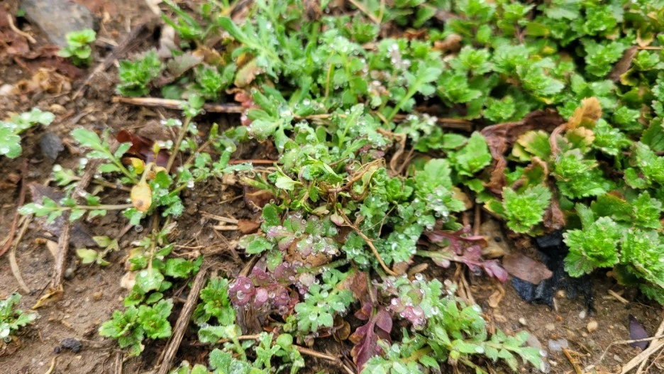 냉이 위에 있는 이슬 사진을 찍으려고 앉았는데 "아이고" 소리가 저절로 납니다.
