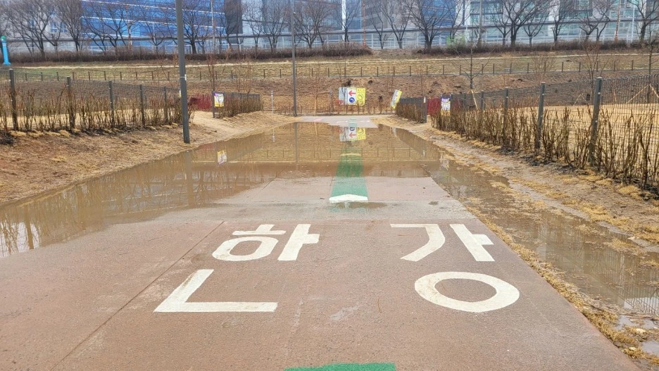 러닝화는 구멍이 숭숭 뚫린 천으로 되어있기 때문에 발이 젖으면 여간 불편한 게 아닙니다. 몇 번이나 피하고 피하고 돌아서 가는 길인데 여기서 또 물 만났습니다. 요즘 제가 코로나 양성으로 감기 몸살 이후 컨디션이 회복되고 있어서 달리기 물 만났네 하고 생각 중인데 이런 물을 만날 줄은 몰랐습니다.