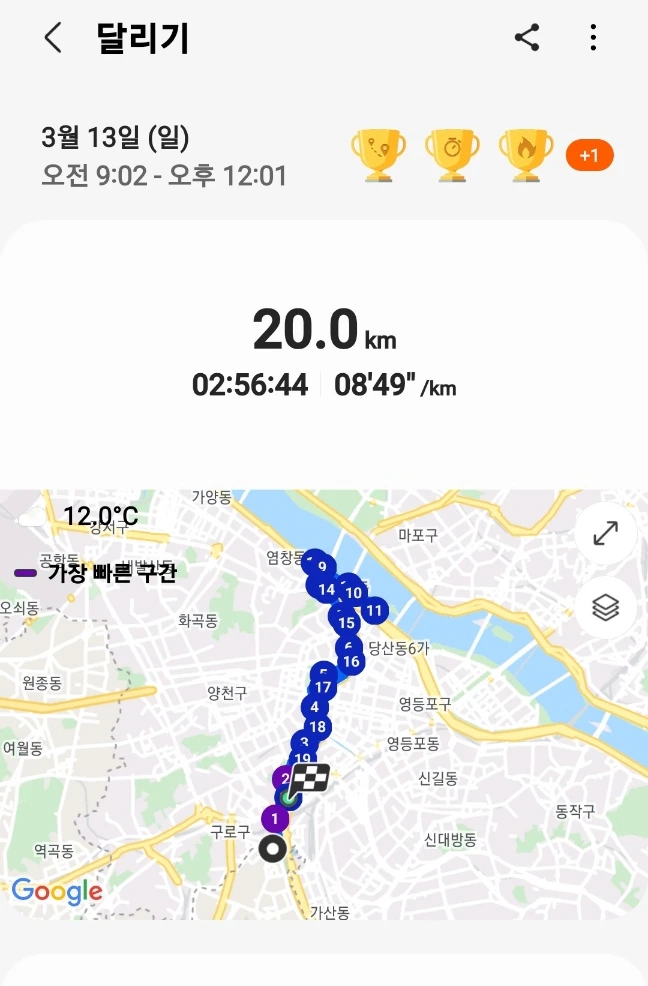 그럼에도 20km는 생애 두 번째 달리기로 성취감을 주었습니다. 5km도 걷다 말다 했는데 20km 라니 상상할 수 없는 거리였습니다. 10km 처음 달릴 때도 집에 가서 쓰러져 잤는데 20km라니, 내가 많이 늘었구나 하는 생각이 들었죠.