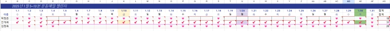 첫날하고 나서는 앞 허벅지에 근육통이 생기더군요. 매일 10km 뛰는데도 새로운 근육통 경험이었어요. 1월 근력운동 챌린지는 정은 님은 스쿼트 18일, 저는 플랭크 20일, 재희 님은 스쿼트 31일을 다 했어요.