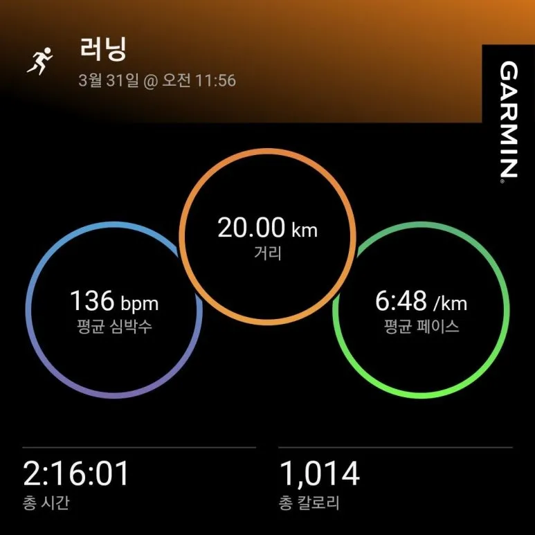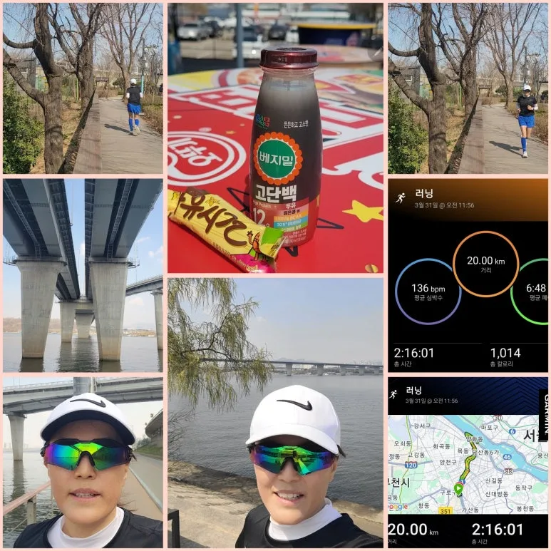20km를 2시간 16분에 완주했어요. 6분 48초 페이스로 나쁘지 않은 페이스입니다. 앞으로 더 좋아지겠지요. 무엇보다도 한강 혼자 다녀온 것과, 3월 목표 20km 채워서 너무 기쁩니다. 하기 싫어도 하다 보면 하게 되는 저를 발견합니다. 누가 더 하기 싫은 일을 잘 해내는가가 관건이 아닐까 생각도 들고요.
