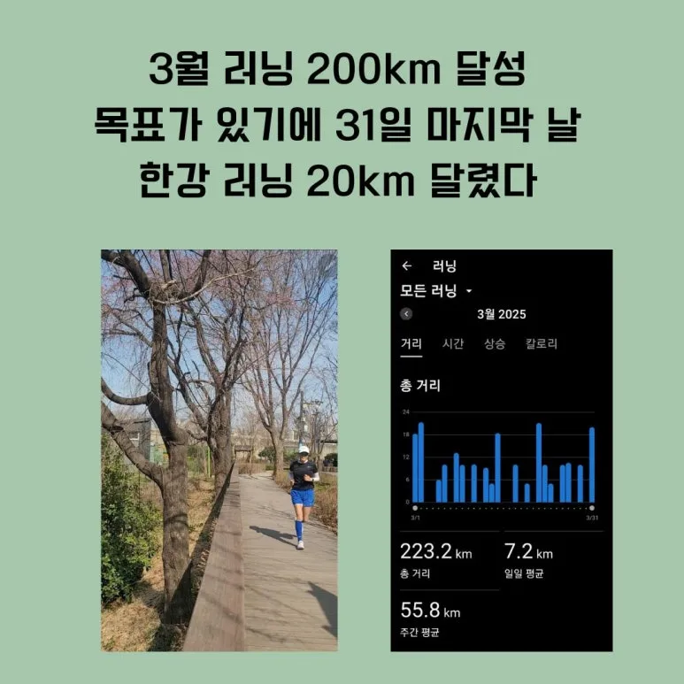 러닝이 목표가 아니라 생활화하려고 합니다. 안 하면 이상한 것처럼 습관, 생활화해야 하는 게 운동이 아닐까 합니다. 다른 목표는 못 이룬 게 많지만 운동만이라도 해내고 싶은 3월이었어요.