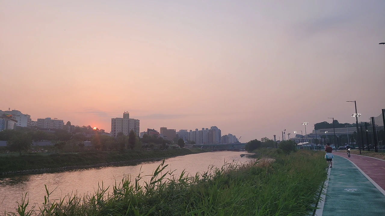 해가 지는 모습을 보니 사진을 찍지 않을 수 없다. 달리기에 흐름이 끊기면 다시 달리기가 힘들지만 초반이니 기꺼이 멈춰서 사진을 찍는다. 아마추어 달리기에서는 기록보다 중요한 게 풍경사진이다. 더욱이 기록을 남기로 싶어 하는 나로서는 풍경이 먼저다. 붉은 노을이 주황으로 옅어지는 하늘과 풀과 건물 풍경은 생각을 멈추게 하고 발을 멈추게 한다. 생각을 멈추게 하기에는 달리기가 제격이다. 이런저런 생각이 나다가도 힘들어지만 생각을 할 수 없이 호흡하기도 바쁘다.