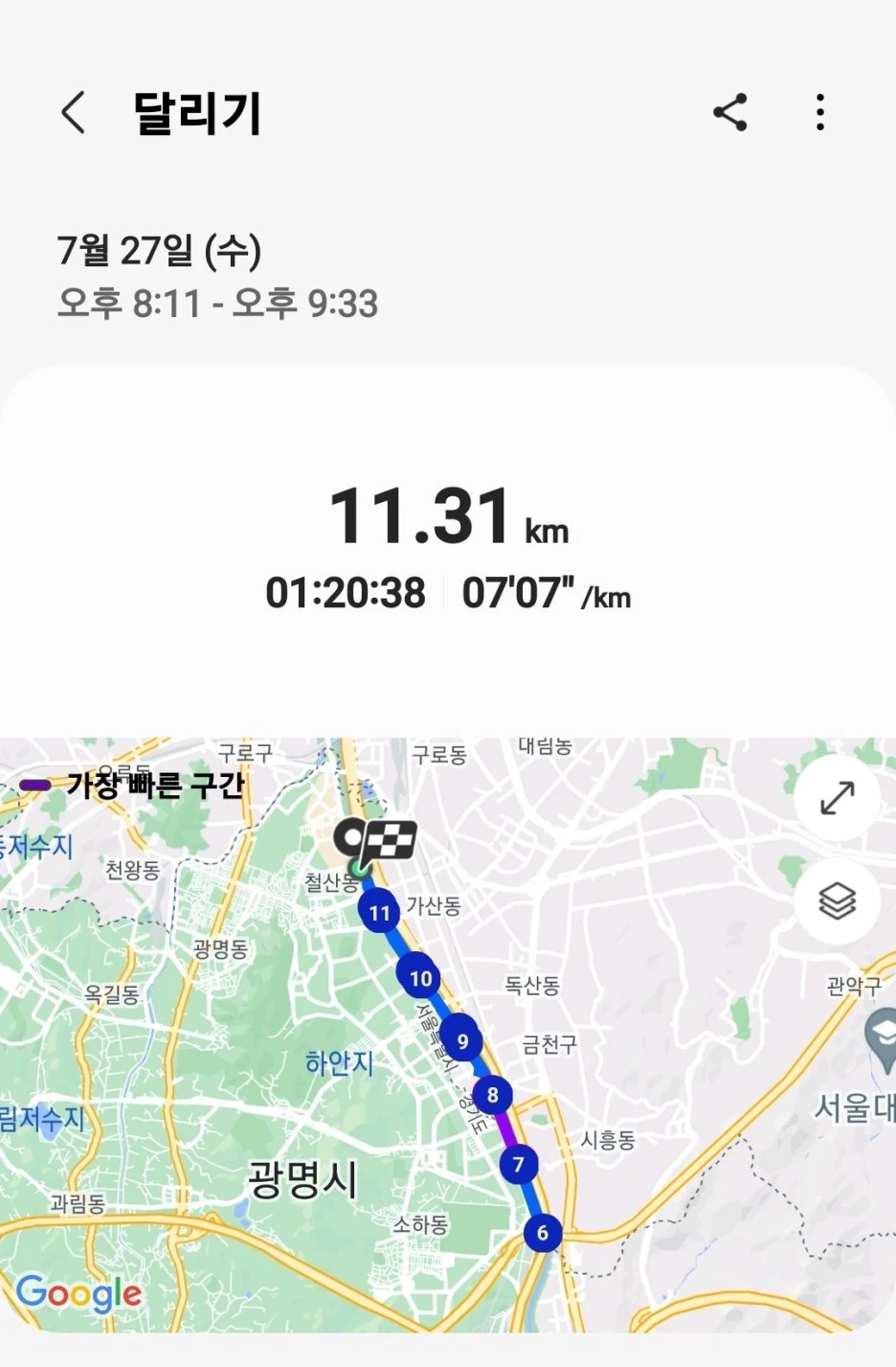처음 1~3km는 광명 마라톤 클럽 멤버들과 같이 달려서 제 속도보다 빠른 듯이 시작했습니다. 이 속도 쭈~욱 달려보자는 생각에 속도감을 느끼며 유지하려고 애썼습니다.