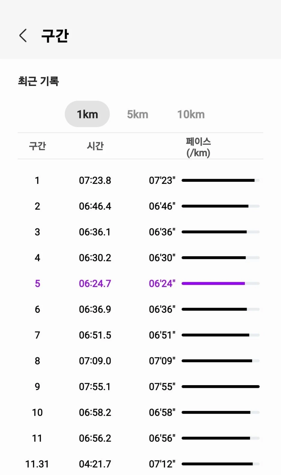 무엇보다도 km 구간 기록이 마음에 듭니다. 기록도 들쑥날쑥하지 않고 아름다운 숫자 6이 많이 보입니다.