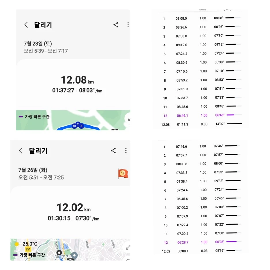 12km에 6분대가 8개인 경우는 처음입니다. 7분 30초대에 달리다가 6분대는 안될 거야라고 생각했는데 몸을 7분 이내 시간에 맞추라는 훈련부장님 말에 연습했더니 6분대가 가능해졌어요. 내가 정한 한계를 자꾸 깨는 기록이 재미있습니다. 이 기록을 깨면 다음에 힘들 텐데 하는 생각도 들긴 했어요~^^