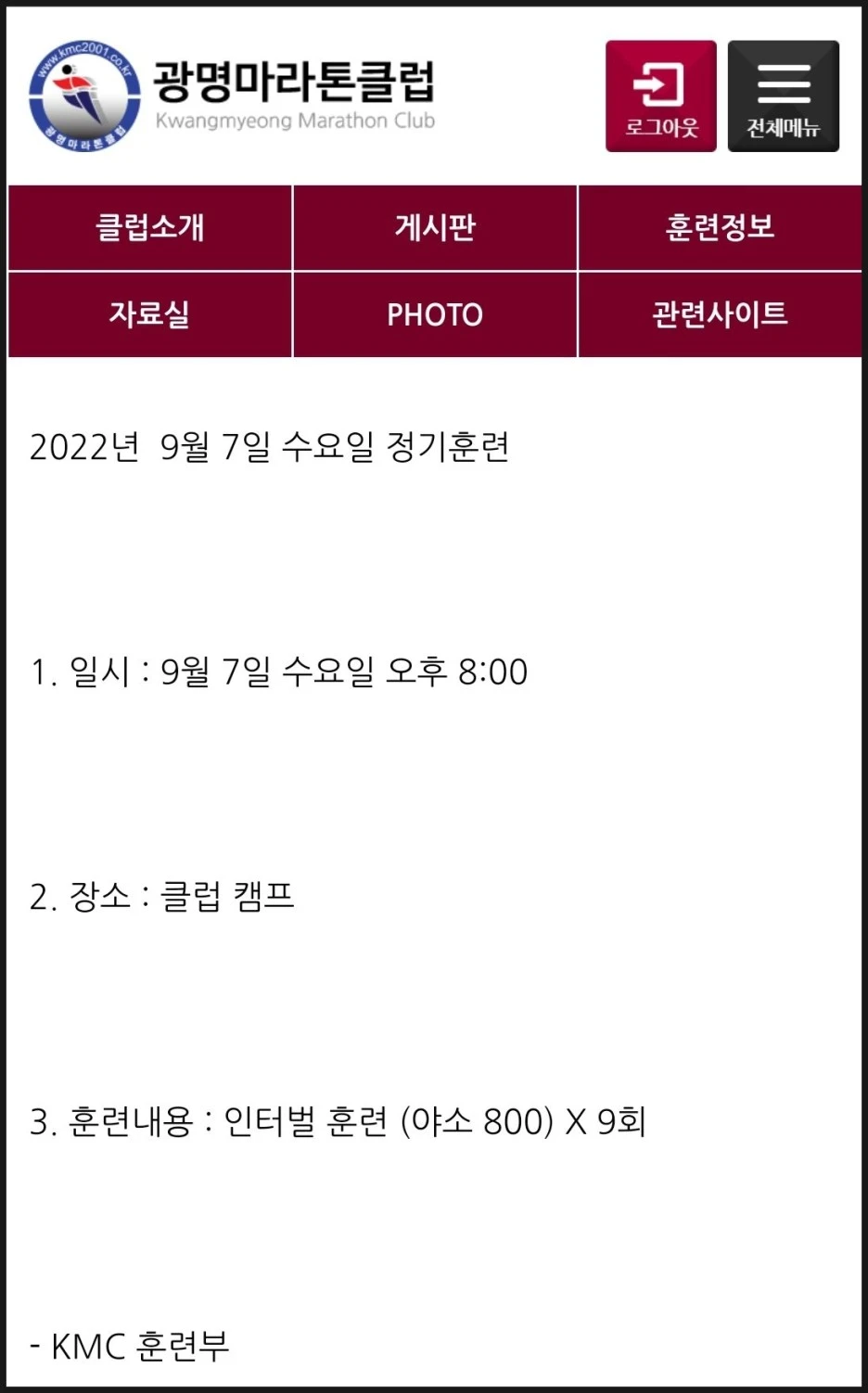 일주일 동안 조용히 지냈는데 이제 슬슬 달리기를 하고 싶은 마음이 다시 생깁니다. 내일 수요일 훈련에는 어떤 훈련인가 광명 마라톤 클럽 홈페이지를 봤습니다.