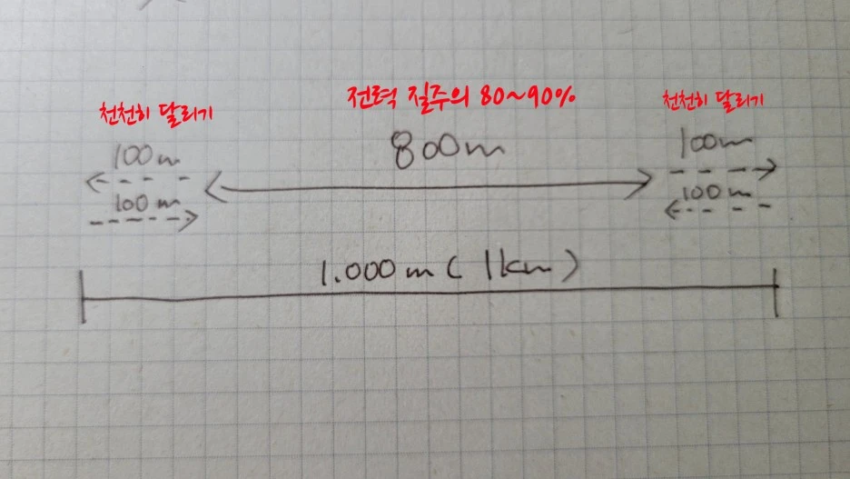 800m를 자신의 전력 질주의 80~90%로 달린 후 100m는 천천히 달리다가 다시 100m를 천천히 돌아와서는 다시 800m를 전력 질주의 80~90%로 달리는 것입니다.
