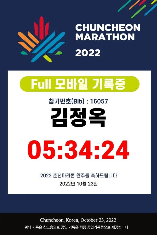 조직적으로 도움으로 주신 광명 마라톤 클럽에게 큰 감사를 드립니다. 어디서나 큰 격려, 응원, 조언, 자원봉사 덕분에 제가 그 어려운 2022 춘천 마라톤 풀코스를 완주하게 되었습니다.
