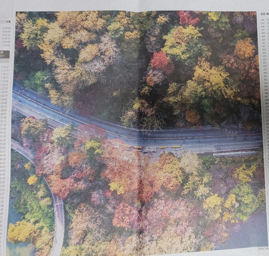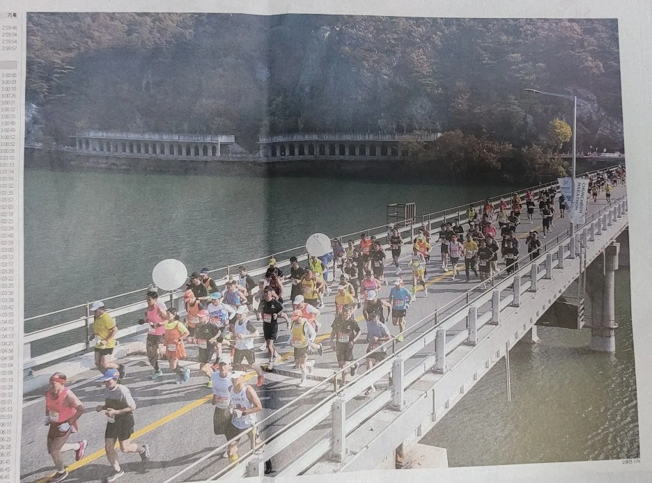 핸드폰 카메라로 달리는 풍경을 찍고 싶었지만 첫 풀코스 도전이라 진지하게 달리려고 스마트 워치만 차고 달렸어요. 눈에만 담고 오리라 마음먹었지만 아쉬웠는데 이렇게 신문에 멋진 풍경을 보니 위로가 됩니다. 다음에는 핸드폰을 가지고 뛰어볼까 생각 중입니다. 조금의 여유가 생길까요?