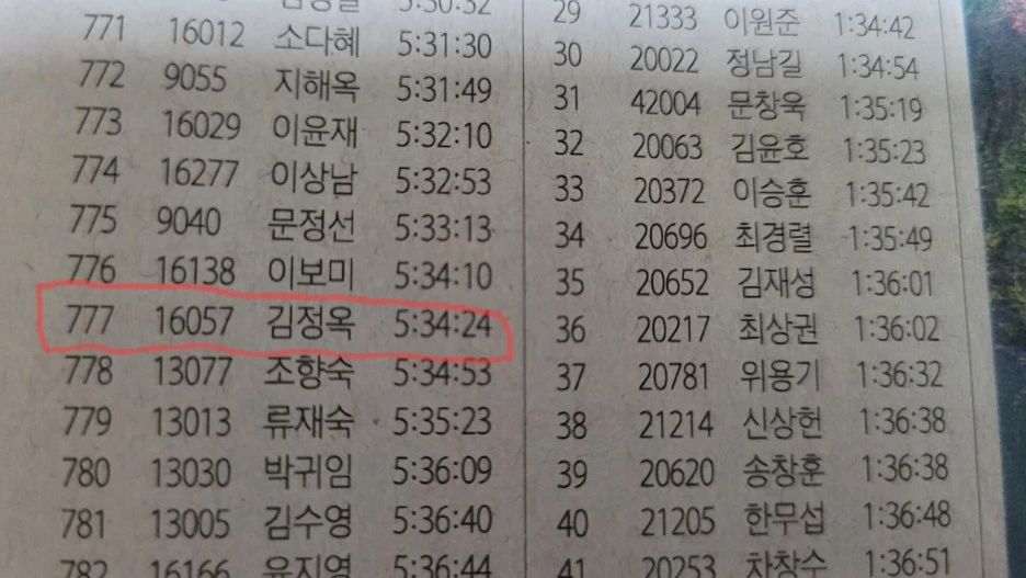 남자 풀코스 완주는 5515명, 여자는 876명인데 저는 777위입니다. 잘 달리는 분들이 엄청 많다는 이야기입니다. 풀코스 완주만도 힘든데 대단한 내공들입니다.