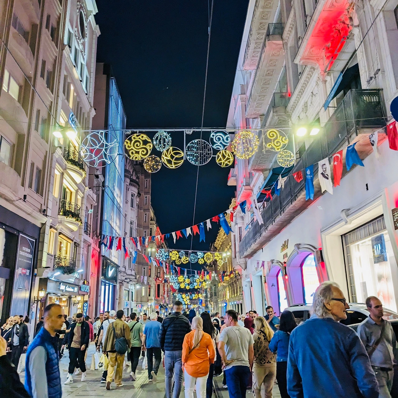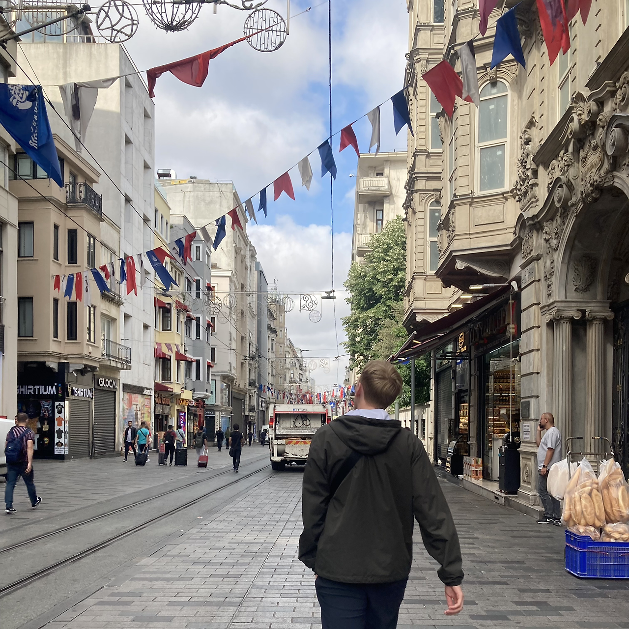 우리가 이스탄불 여행을 하면서 묵었던 숙소는 탁심 지역에 있었는데, 명동 거리와 같은 쇼핑거리인 이스티클랄 거리와 약 2블록 정도만 떨어져 있어서 항상 집에 돌아갈 때면 이 이스티클랄 거리를 지나가야 했다. 남편과 나는 이 이스티클랄 거리를 매우 좋아했다. 길게 뻗은 길의 한가운데에는 이스탄불의 명물인 트램이 가끔씩 다니면서 거리의 매력을 배가시켜 주었다. 거리 위에는 전구와 깃발이 끝없이 매달려 있어서, 낮에는 바람에 일렁이는 깃발이 마치 물결이 이는 것 같았고, 밤에는 반짝이는 전구들이 낭만적인 분위기를 자아내었다.