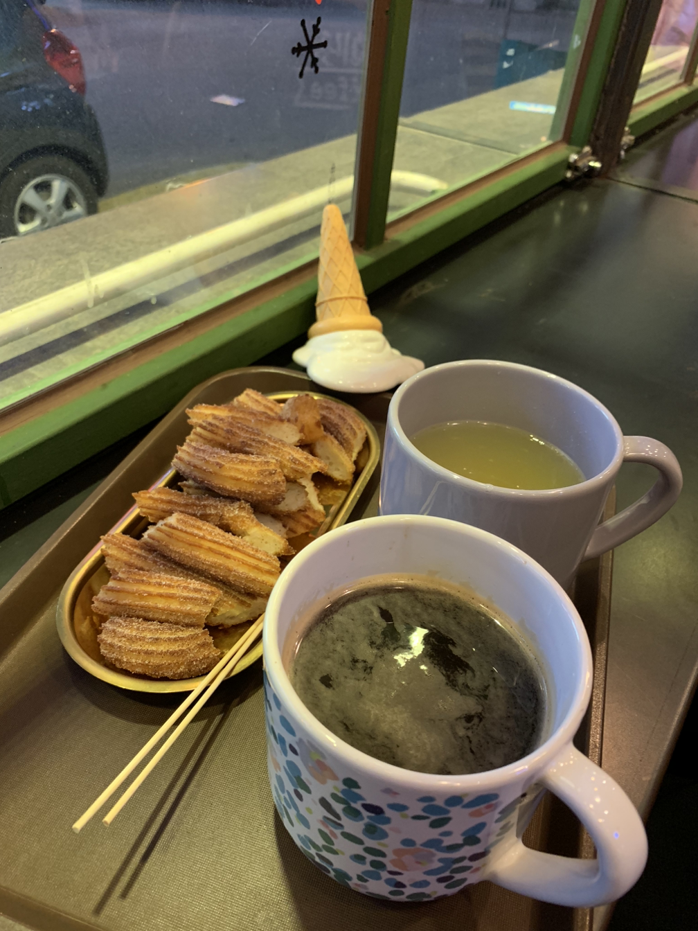 그의 드립커피와 나의 레몬차 그리고 금방 튀겨 나온 츄러스.