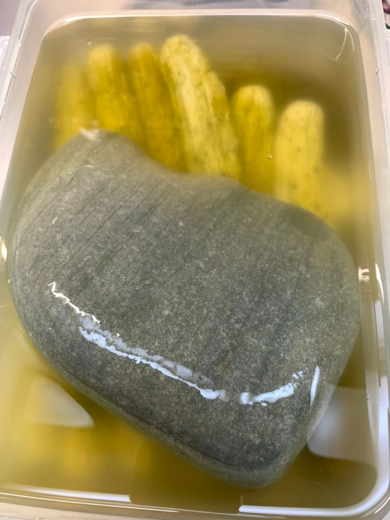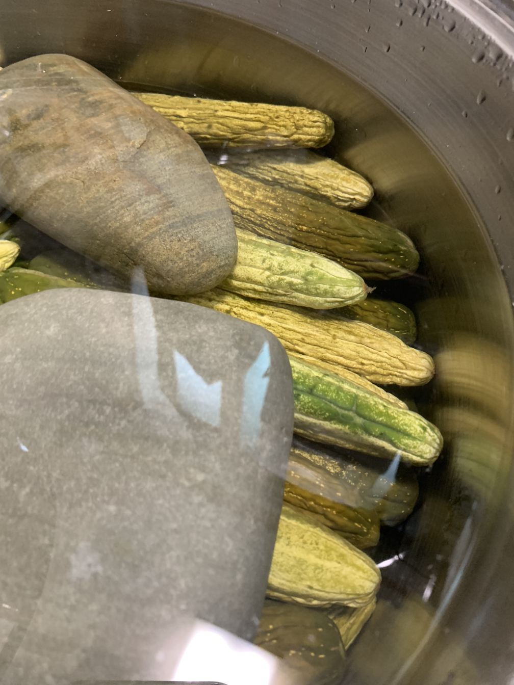 2. 하루가 경과하면 오이를 건져 앞으로 보관할 통에 옮겨 담고 돌로 눌러둔다.