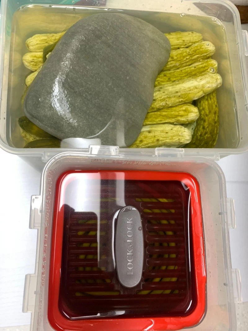 3. 하루가 지나면 오이를 건져 2차 보관용기에 담고, 누름돌로 눌러둔다.