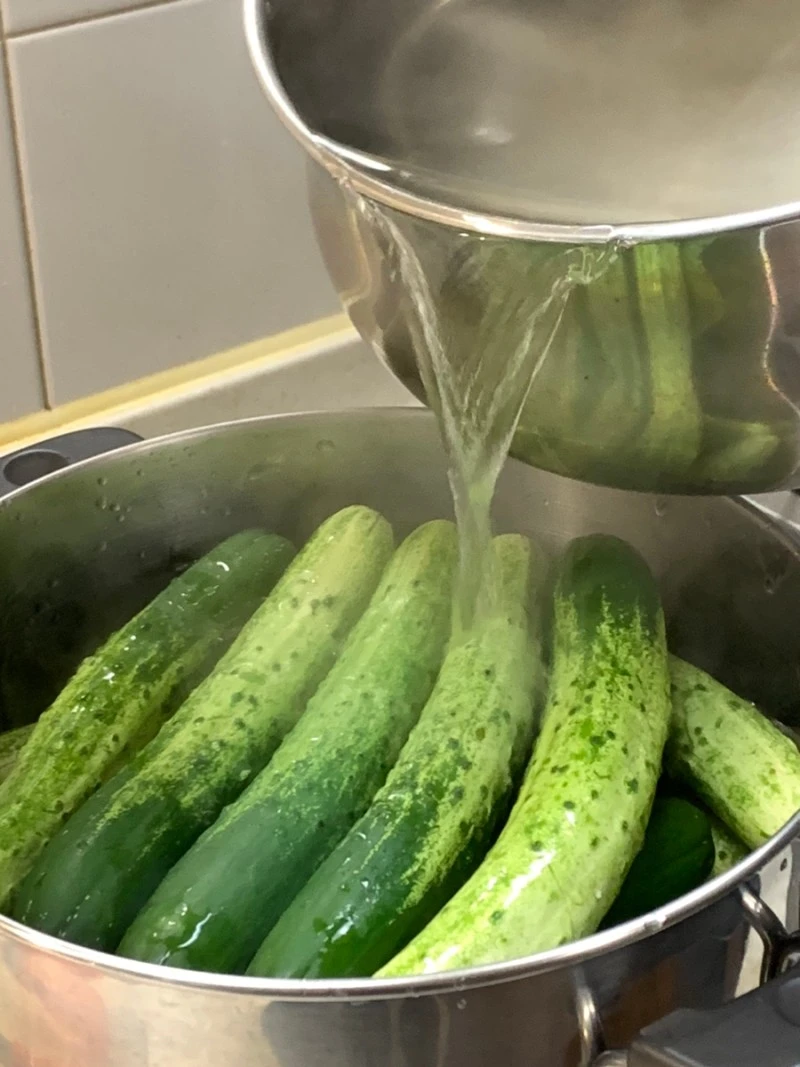 사전 작업을 마쳐 눌러둔 오이 위로 펄펄 끓는 소금물을 한 번에 부어준다.